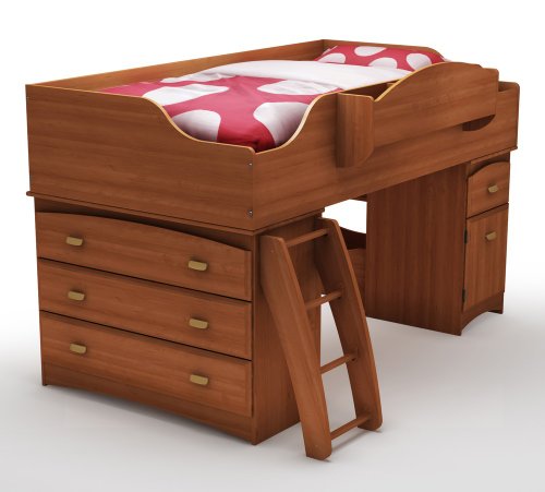 This loft bed is a great solution for optimizing space in small bedrooms. It has been designed to be both safe and practical, with lots of storage space. It is composed of a 3-drawer chest, a top bed and a ladder, plus a storage unit with a door, a drawer and a toy box. 3576-LBED Features: 3 different configurations possible Open space underneath the bed for a little nook to play in Student desk that can be rolled into the open for homework and art projects (3576070), sold separately Add even more storage with a 2-drawer chest (3576043), sold separately Perfect height for parents to tuck their child in at night and make the bed in the morning Large metal glide drawers The utility bin on the bed provides a space where the child can put glasses and books before going to sleep The storage units on each side are interchangeable to suit your needs Can be put in a corner against a wall; toys and books remain accessible from the inside Morgan Cherry Finish Transitional Style ASTM certified Ready to assemble Manufactured from engineered wood products Our EPP (Environmentally Preferable Product) certified product uses panels made entirely of recycled fibres This item's packaging is ISTA 3A-certified to ensure the product's integrity and your total satisfaction Adult assembly required 5-year limited warranty Made in Canada Finish: Morgan Cherry Dimensions: Overall: 77 3/4"(W) x 48 1/2"(D) x 51 3/4"(H) Loft Bed Case: 76.5"(W) x 40.25"(D) x 15"(H) Dresser: 41"(W) x 17"(D) x 30.25"(H) Storage Unit: 41"(W) x 17"(D) x 30.25"(H)